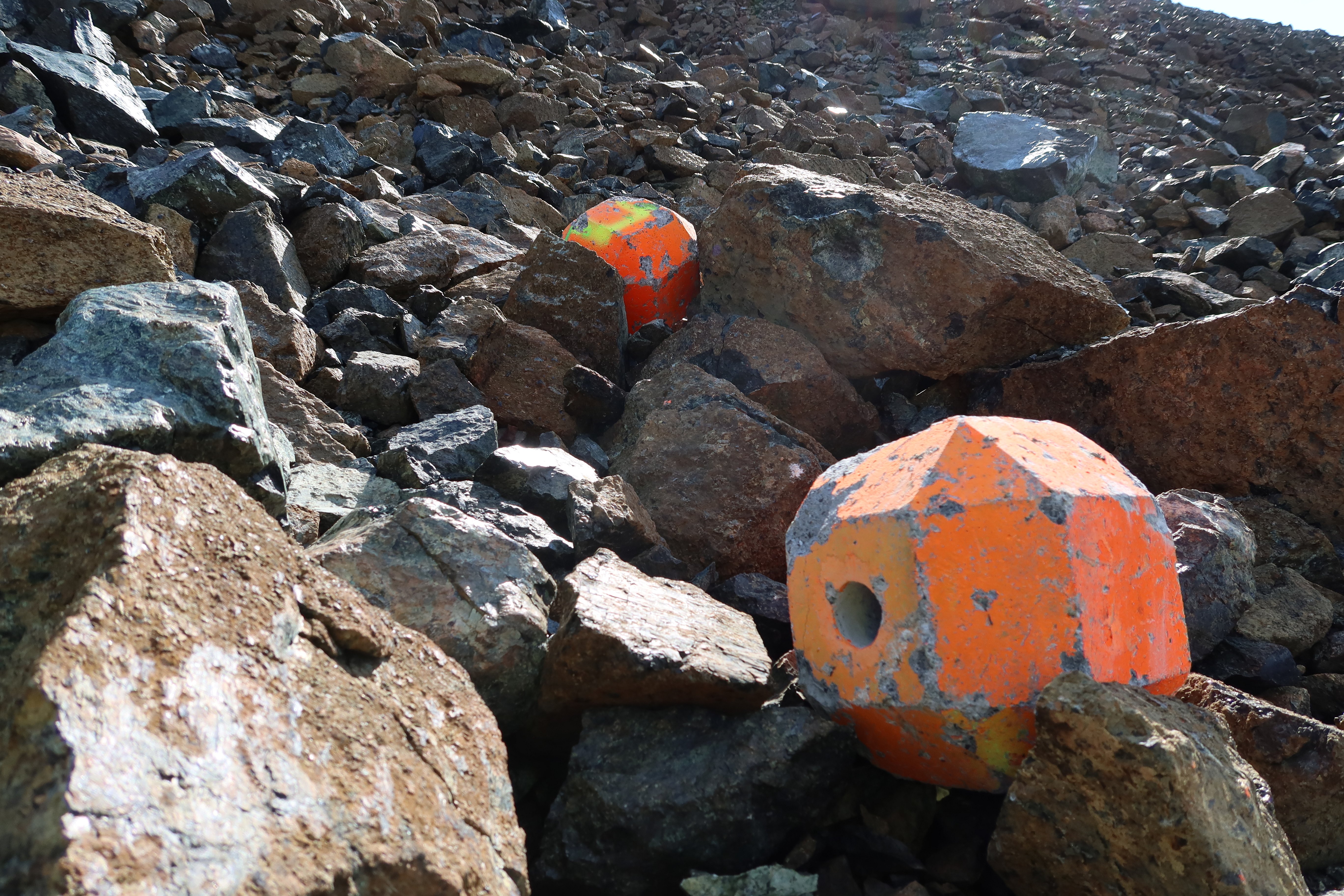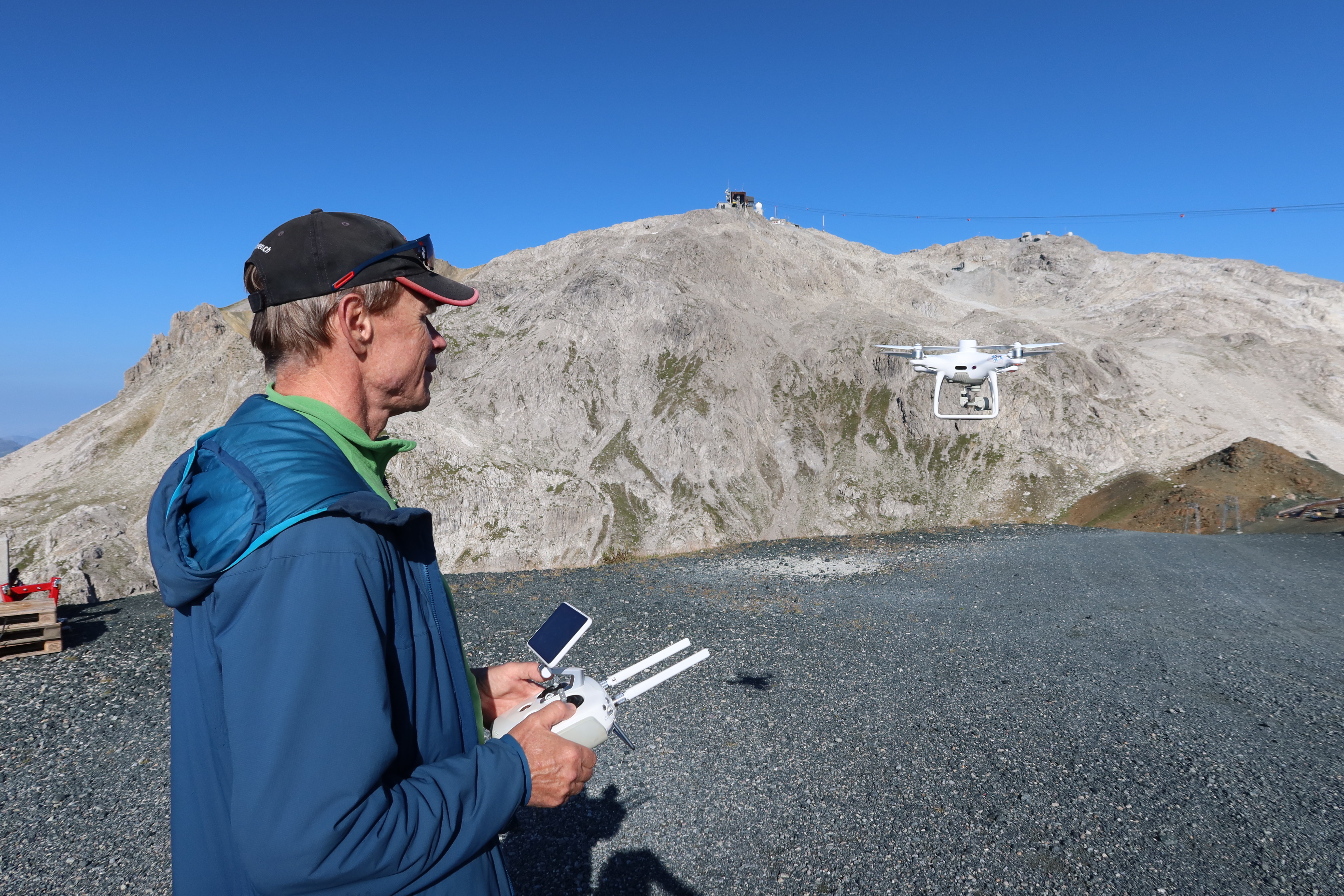 Ab und zu entsteht bei den Tests eine Pause. Dann ist der Wanderweg frei und SLF-Fernerkundungsspezialist Andi Stoffel vermisst das Gelände, in dem die Steine liegen, mit Hilfe einer Drohne. Von oben sieht es aus, als hätte jemand einer Partie Boccia am Hang gespielt, mit zugegebenermassen grossen Kugeln.